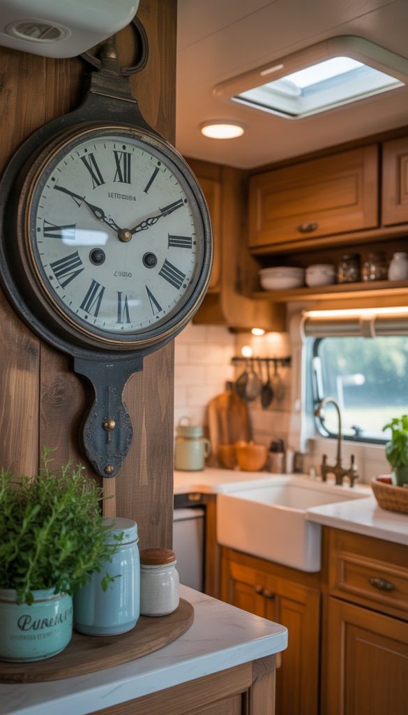 A vintage French clock adds charm to your RV kitchen. It brings a touch of old-world style that fits perfectly with the French country look.