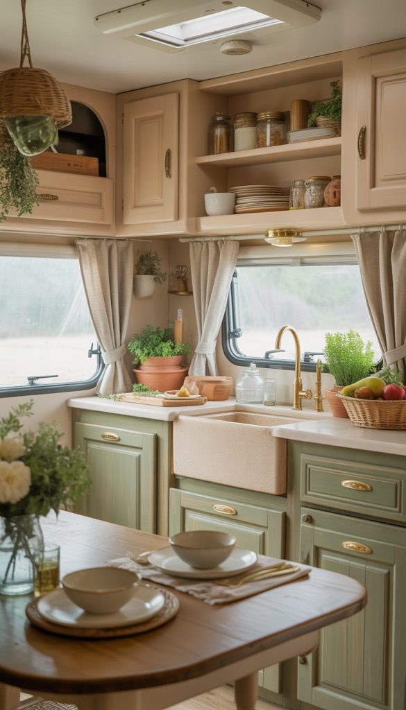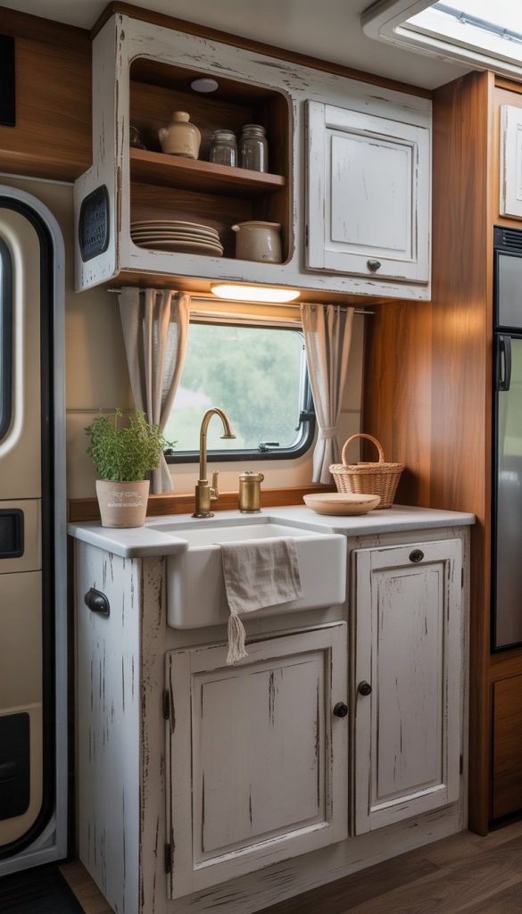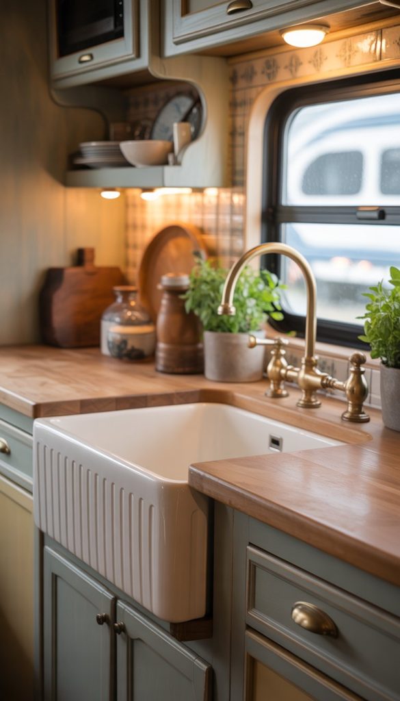 Choose a white or cream apron-front sink to keep the space bright and airy. Pair it with brass or bronze fixtures to enhance the vintage farmhouse feel. This small change can make your RV kitchen look warm and welcoming.