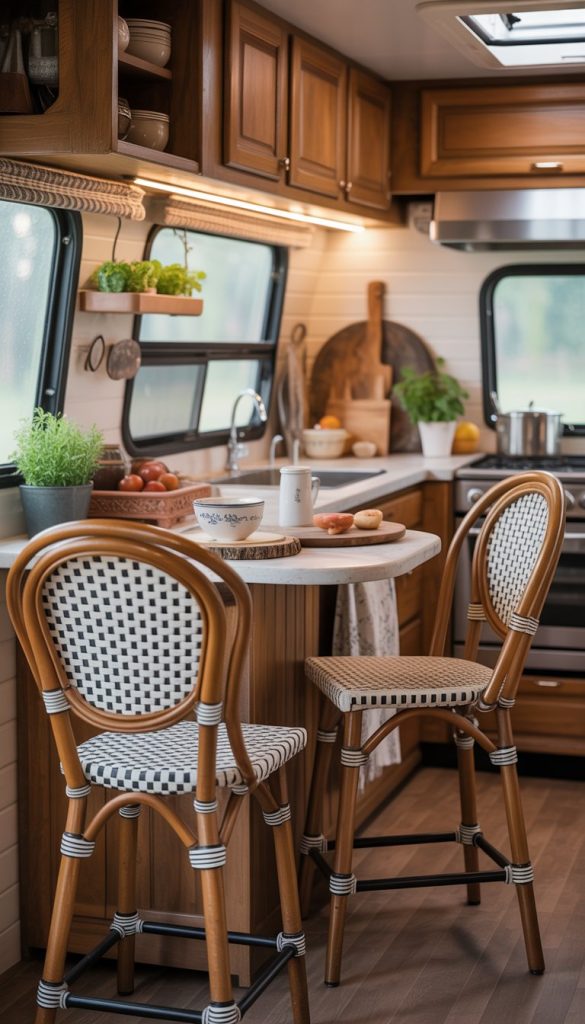 Classic French bistro stools bring a simple, cozy charm to your RV kitchen. They usually have a round wooden seat and thin metal legs. These stools are light, so you can move them easily when you need more space.