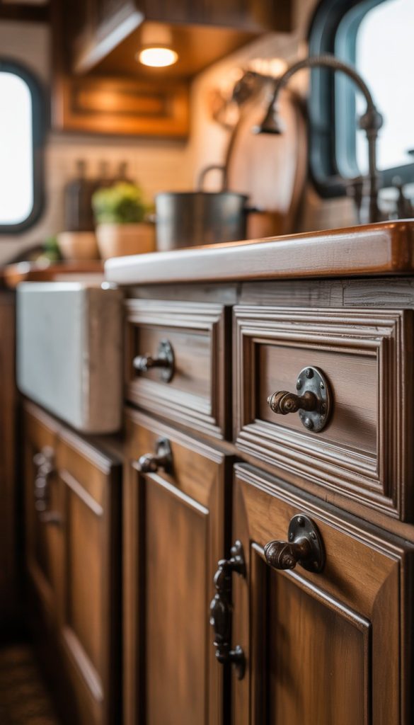 Antique bronze cabinet handles add a warm, classic touch to your French Country RV kitchen. Their dark, rich color fits well with natural wood and light-colored cabinets. These handles give your space a cozy and timeless feel.
