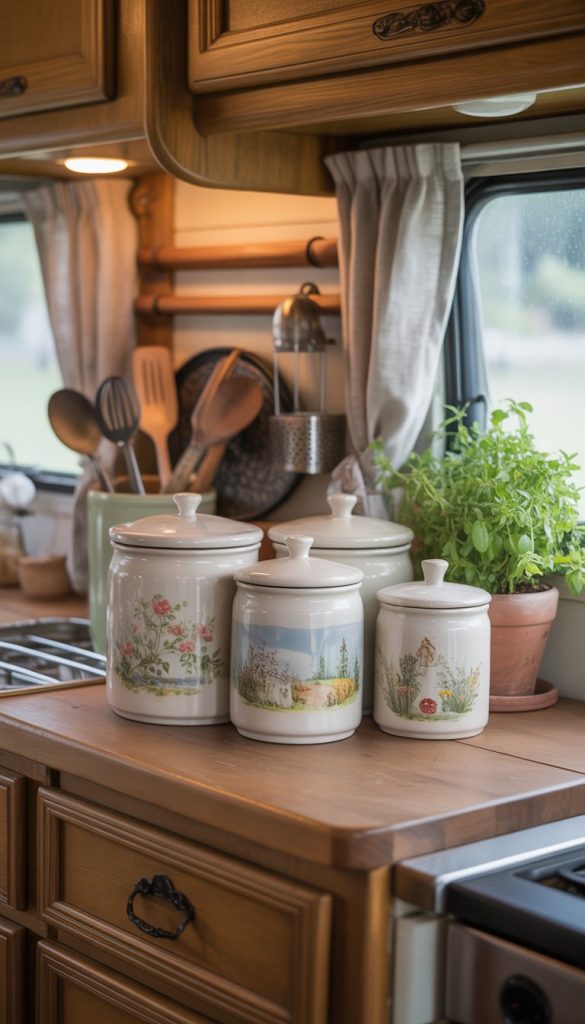 Hand-painted ceramic canisters add a lovely touch to your French Country RV kitchen. They bring color and charm while keeping your ingredients fresh.