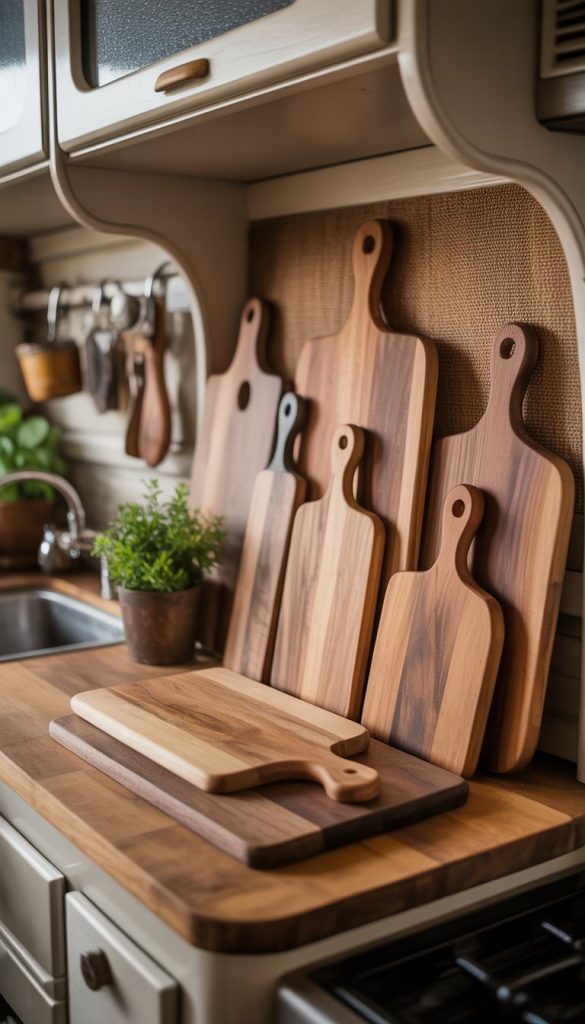 Adding rustic wooden cutting boards to your French Country RV kitchen brings a warm and natural touch. You can hang them on the walls or lean them against a backsplash for easy access. Their natural wood grains add charm and a cozy feel to your space.