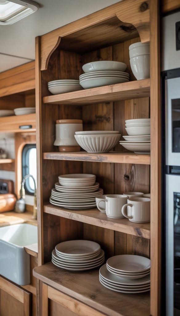 Open wood shelves bring a warm and natural feel to your RV kitchen. You get to show off your favorite rustic plates, mugs, and bowls. This makes the space feel cozy and personal.