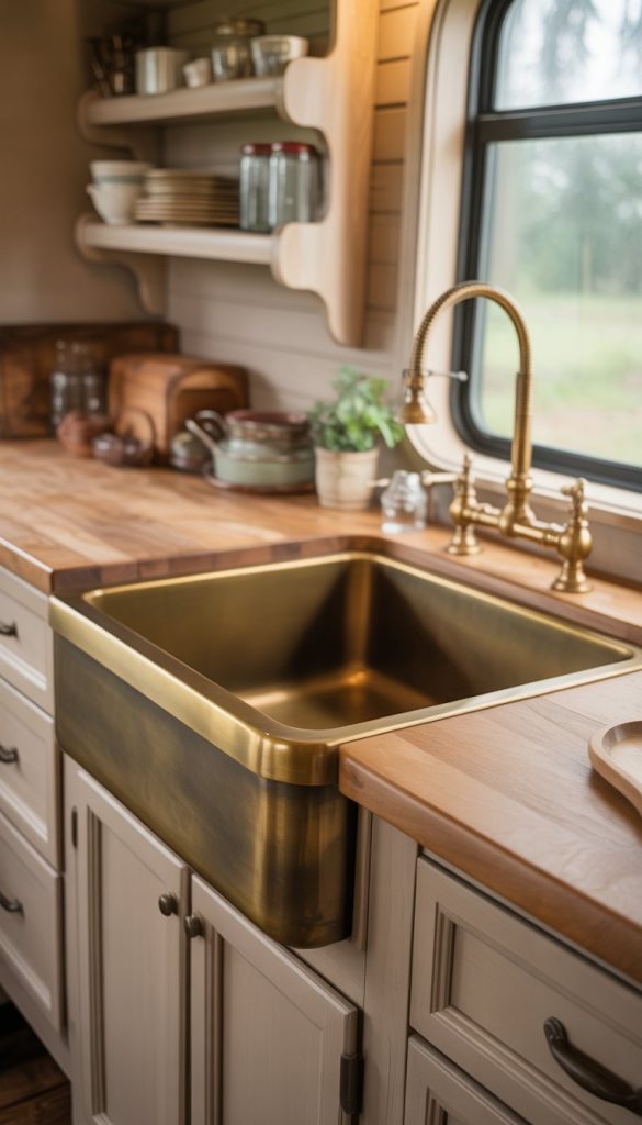 An antique brass farmhouse sink brings a warm, rustic feel to your RV kitchen. It adds charm and vintage style that matches the French country look perfectly. The brass finish gives a unique glow that can brighten your cooking space easily.