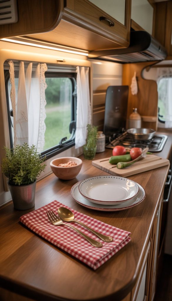 Adding classic gingham print napkins to your RV kitchen brings a warm, cozy touch. The simple checkered pattern fits perfectly with the French country style. It’s a small detail that makes your dining area feel more inviting.