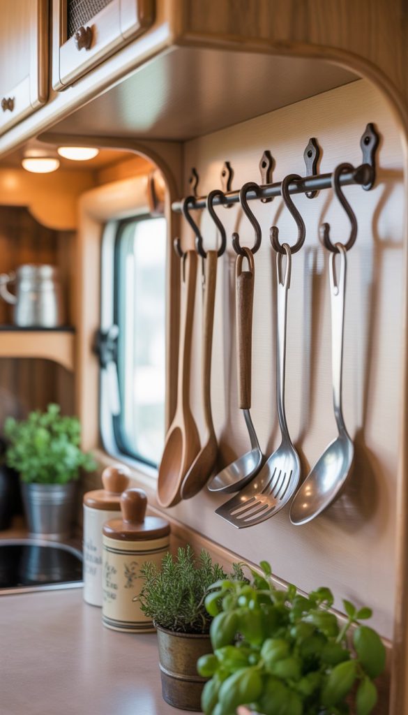 Wrought iron hooks add a classic look to your French Country RV kitchen. They help keep your utensils organized and easy to reach. You can hang spoons, spatulas, and even small pots on them.