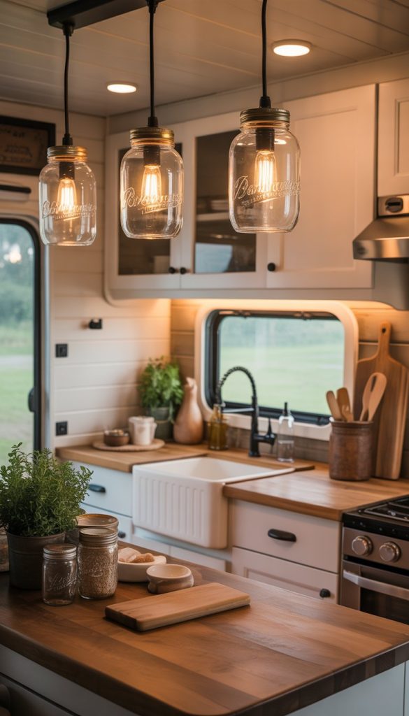 Mason jar pendant lights add a cozy touch to your RV kitchen. They bring a vintage, country feel that fits the French country style perfectly. You can use clear or tinted jars for different looks.