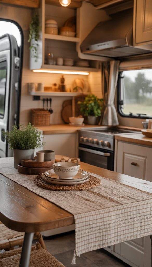 A woven linen table runner adds a soft, natural touch to your RV kitchen. It fits perfectly with the French country style by bringing warmth without too much color. The texture helps keep things cozy and inviting.