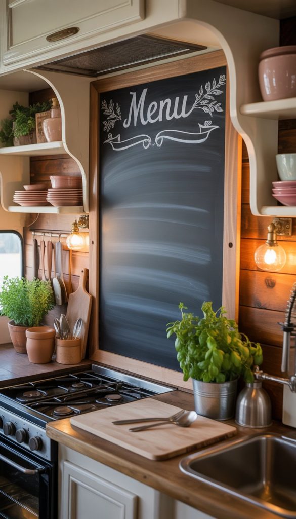 Using a chalkboard adds a rustic and charming touch to your RV kitchen. It fits well with the French country style because it feels homey and old-fashioned.