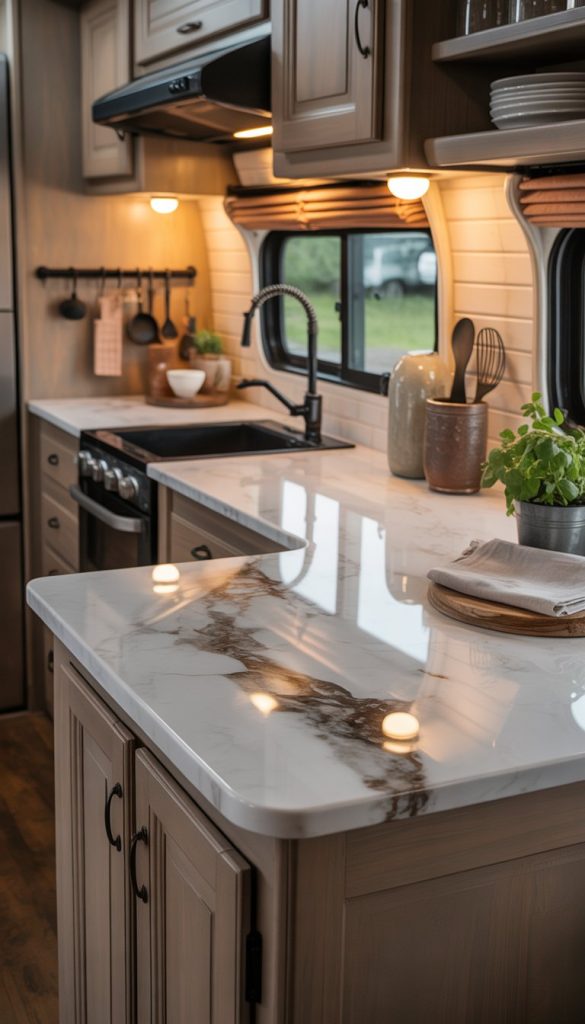 A marble countertop adds a touch of elegance to your French Country RV kitchen. The natural veining patterns make each piece unique. It brings a classic and timeless look that fits well with rustic cabinets and soft colors.