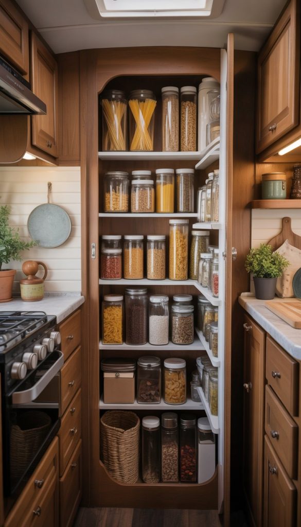An open pantry with glass jars adds charm to your French Country RV kitchen. You can see everything at a glance, which makes cooking easier. It also keeps your space neat and inviting.