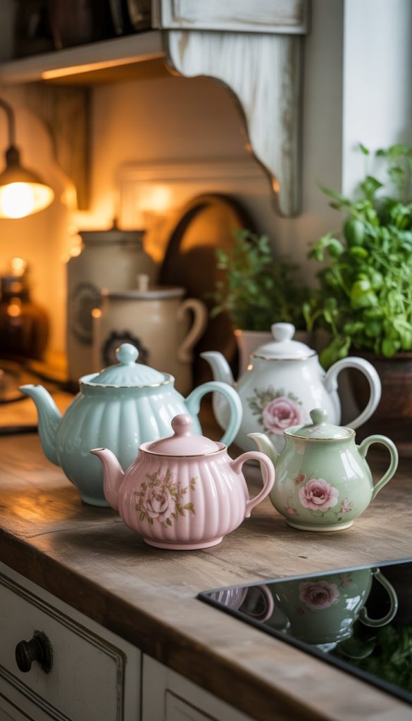 Choose teapots with hand-painted floral designs or simple patterns. They add a touch of old-world beauty without being too busy. You don’t need many—three to five pieces can create a lovely, inviting display.