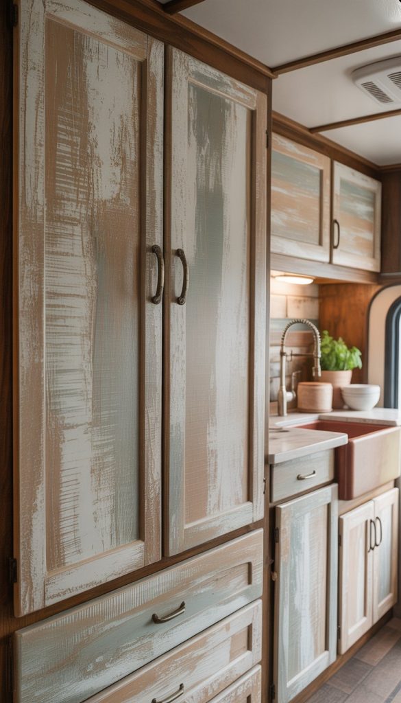 Distressed wood cabinet doors bring a warm, lived-in look to your RV kitchen. They add character with their worn edges and faded paint. This style fits perfectly with the French country theme, making your space feel cozy and inviting.