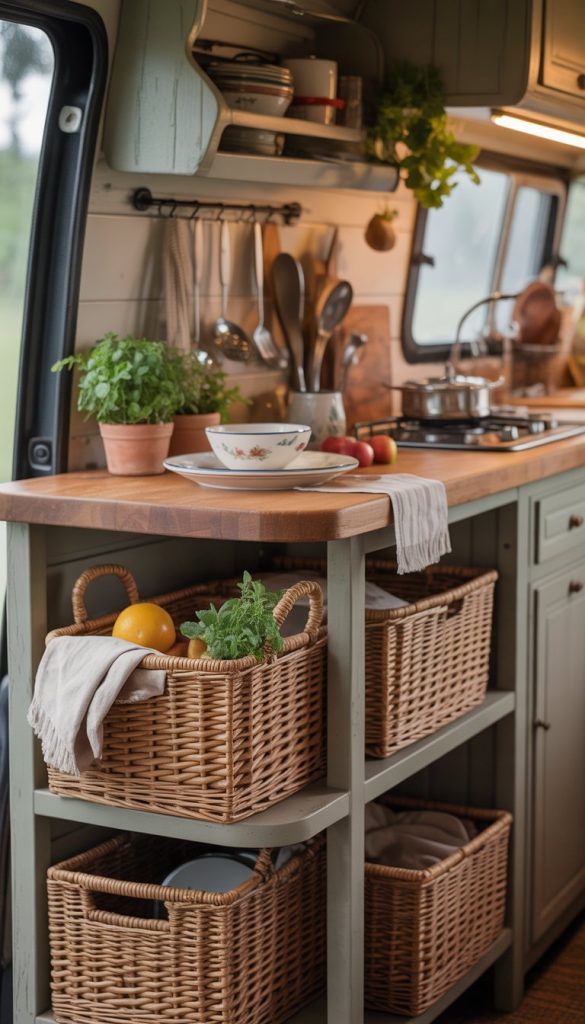 Natural woven baskets add a cozy touch to your French Country RV kitchen. They give your space an earthy look while keeping things neat. You can use them to store fruits, vegetables, or even kitchen towels.