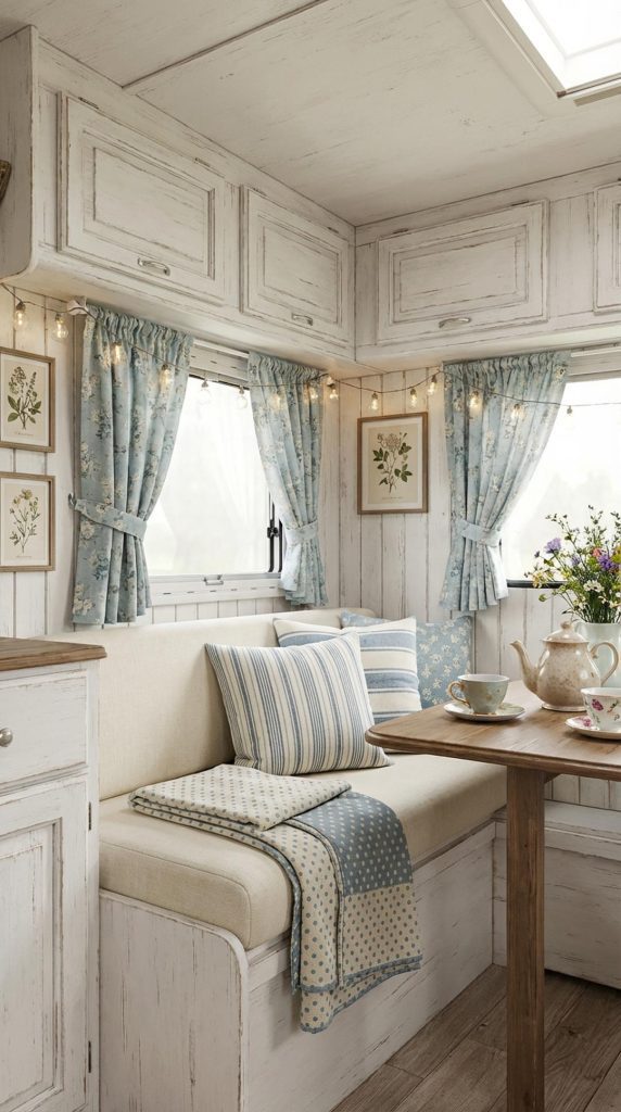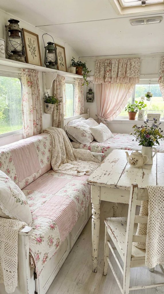 PRO TIP: For an authentic shabby chic look, choose slightly faded or vintage-looking versions of both stripes and florals rather than crisp, bright new patterns. The worn, loved appearance is central to the aesthetic and makes your camper feel like a cherished, collected space with history and character.