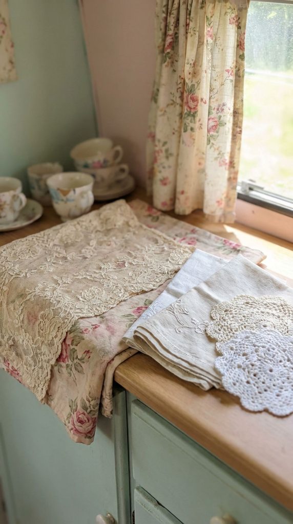 PRO TIP: Hunt for vintage lace and linens at estate sales, thrift stores, and antique markets for authentic pieces with history and character. Small imperfections like tiny repairs or gentle discoloration actually enhance the shabby chic aesthetic, and these vintage pieces are often more affordable than new imitations.